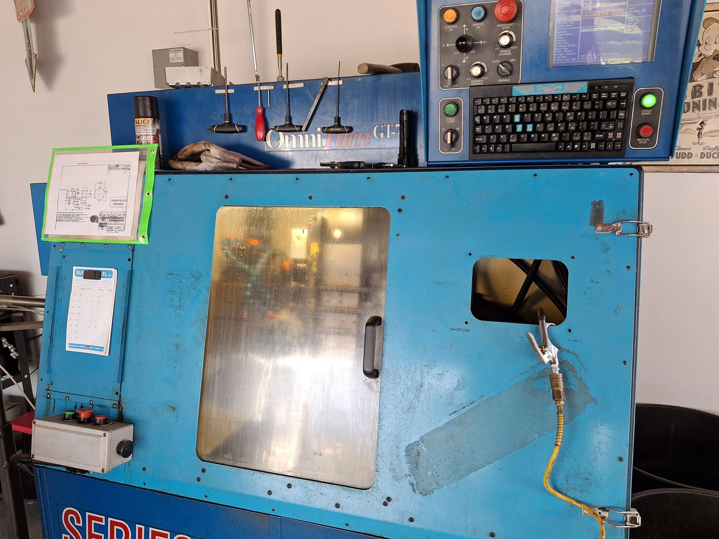 CNC Lathe Production All of southern California or wherever you areSince 2007 Machines 2012 Omniturn GT-75. G4 Controller 4 foot pneumatic bar feeder for fast production. Can hold tolerances of +/- .0005 Harding HSL. Retro fitted to CNC for second Op. Over 200,000 parts made. Materials used Max diameter bar feed. 1 inchMax diameter slug. 2 inch316 L304DuplexC11371018ChromolyPlastics